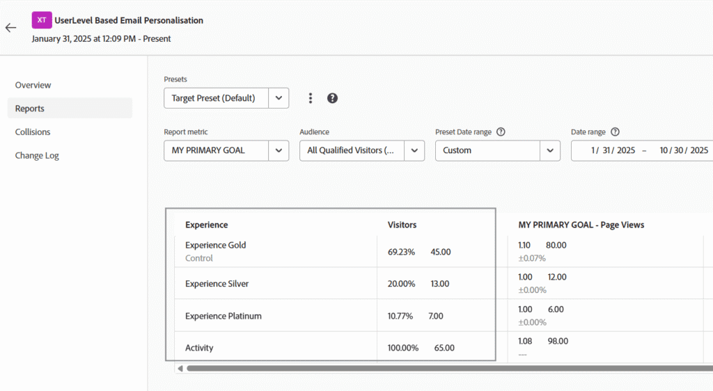 • Adobe Target Reports: Reflects experience-level performance as Target personalises the same page for different user groups.